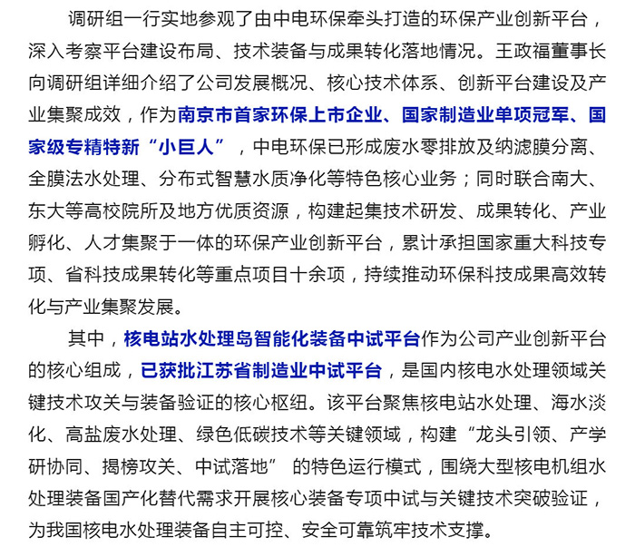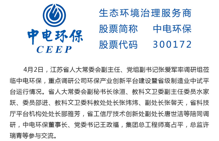 中電環(huán)保股份有限公司是南京市首家環(huán)保上市公司(股票簡稱:中電環(huán)保,股票代碼:300172),南京環(huán)保產業(yè)協會會長單位,國家級聯盟理事長單位,是生態(tài)環(huán)境治理服務商,主營(3+1):水務、固危廢、煙氣治理及產業(yè)創(chuàng)新平臺,包括:工業(yè)水處理、污水處理及水環(huán)境綜合治理;固危廢土壤、污泥餐廚垃圾處理;煙氣及VOCS治理;智慧環(huán)保;高端裝備等。